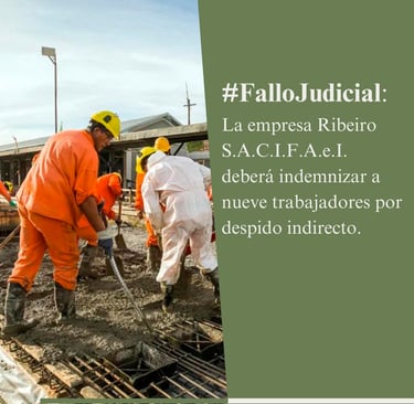 Nuestro estudio obtuvo una sentencia favorable para nueve trabajadores contra Ribeiro S.A.C.I.F.A.e.I., actualmente en concurso preventivo. El tribunal ordenó el pago de indemnizaciones por despido indirecto, diferencias salariales y la doble indemnización prevista por el DNU 34/2019.